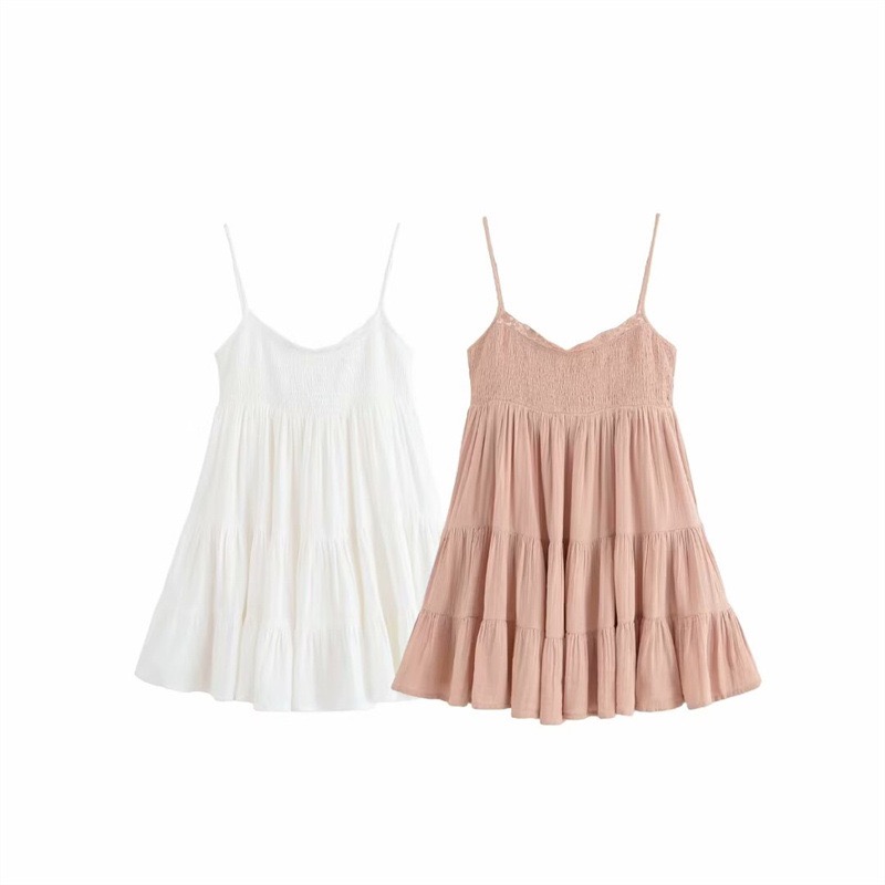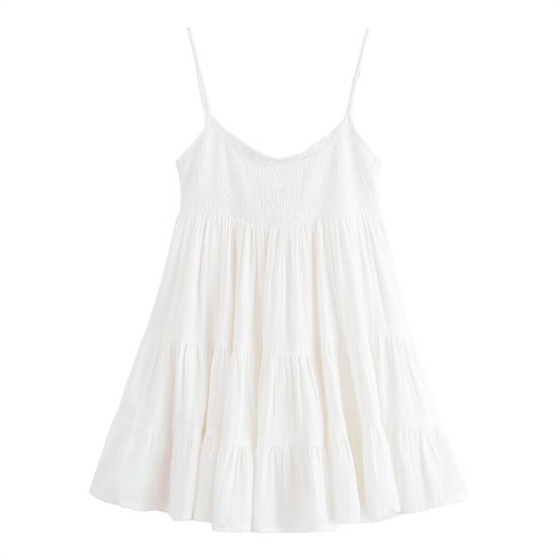 The dress has a babydoll silhouette with a slim-fitting top and a relaxed, tiered skirt. Made from a lightweight, breezy material, it falls into an uneven mid-thigh length hemline.