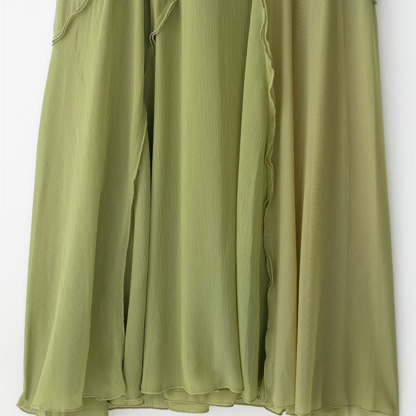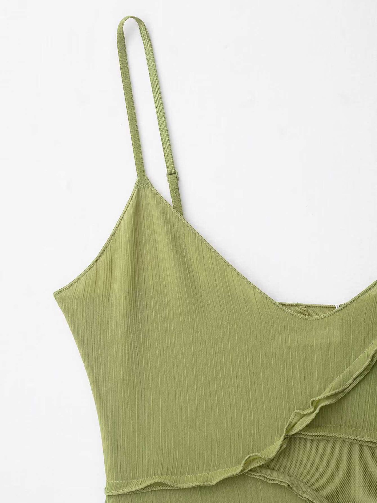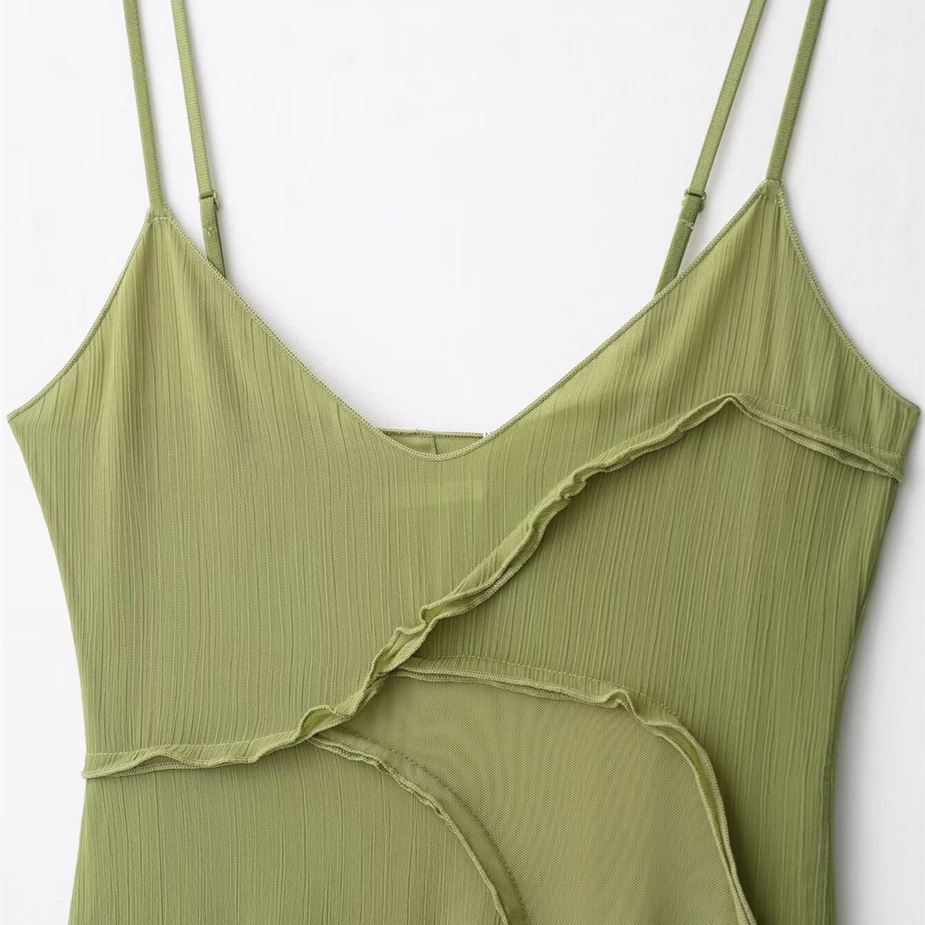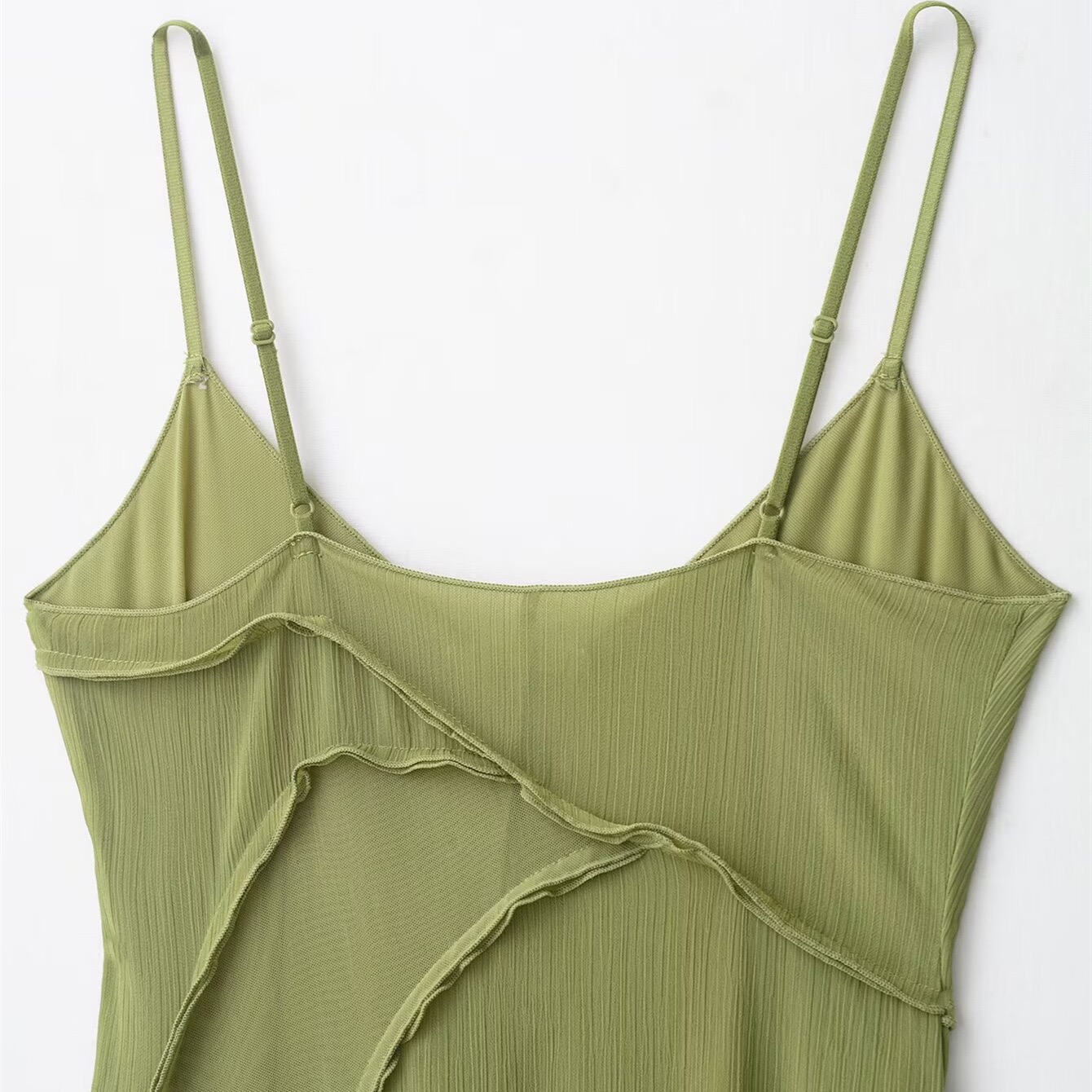 Effortlessly elegant, this olive green midi dress is designed to move with you. Crafted from a lightweight, semi-sheer fabric, it features delicate spaghetti straps and a soft V-neckline for a feminine silhouette. The asymmetrical layered detailing adds subtle texture and dimension, creating a graceful flow with every step. Perfect for brunch dates, evenings out, or elevated casual moments, this dress blends comfort with understated sophistication. Not nig breast friendly.